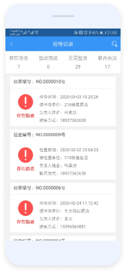名称、地址、检查人员、主要隐患、检查时间等信息。